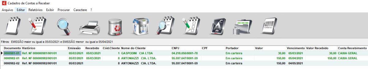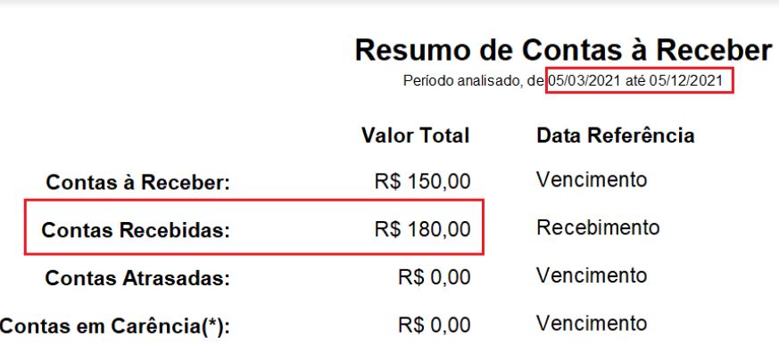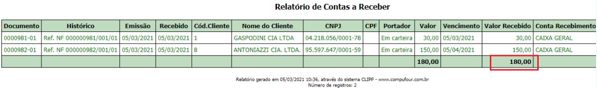 Filtrando pelas contas recebidas e gerando o relatório na tela (pressionando F7) para totalizar, teremos:
