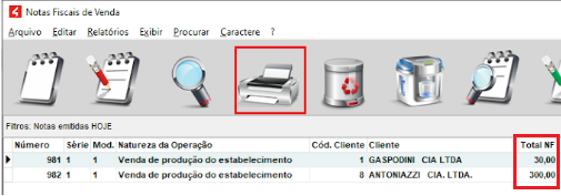 Emissão de Notas Fiscais de Venda, uma nota emitida com o valor de 30 reais e outra com 300;