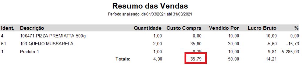 No Módulo Nota Fiscal de Venda - Menu Relatório - Resumo das Vendas, podemos verificar o valor referente ao custo das mercadorias: