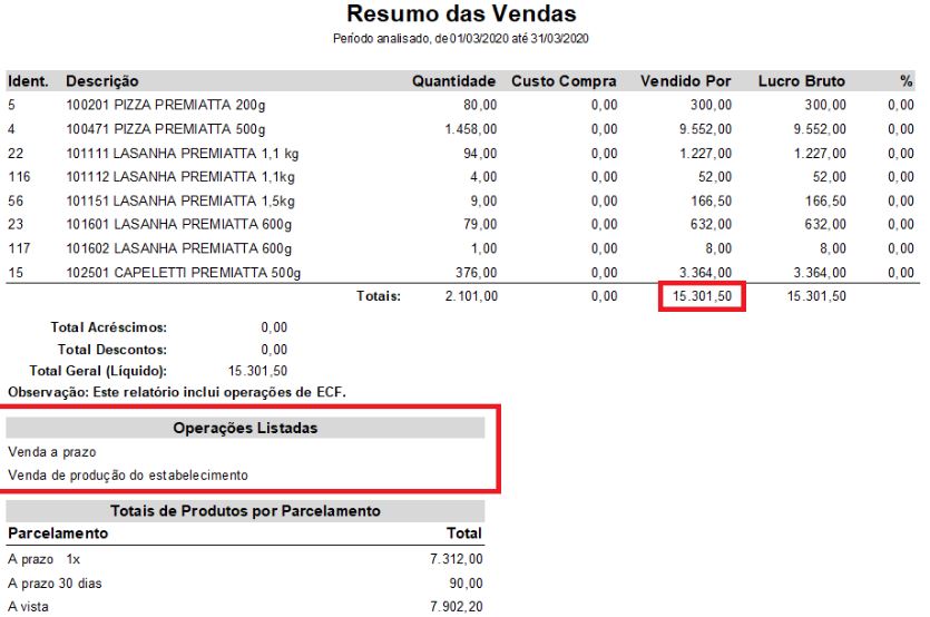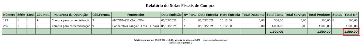 Filtrando as notas na tela e pressionando a tecla F7, será gerado o seguinte relatório, contendo os mesmos valores: