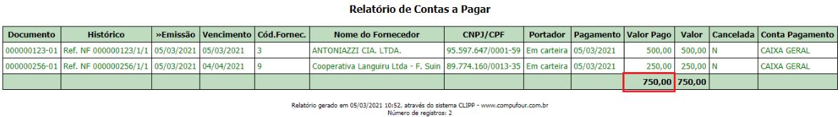 Filtrando pelas contas pagas e gerado relatório (F7) irá totalizar: