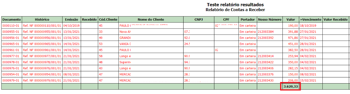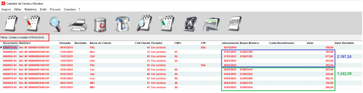 Quanto ao valor das contas vencidas, no módulo Contas a Receber - Filtrar pelas contas Atrasadas, e posteriormente informar a data de vencimento e gerar relatório na tela, poderá ser verificado o valor das contas vencidas mensalmente. Nesse caso, por ser poucas contas, foi feita a soma para conferência.