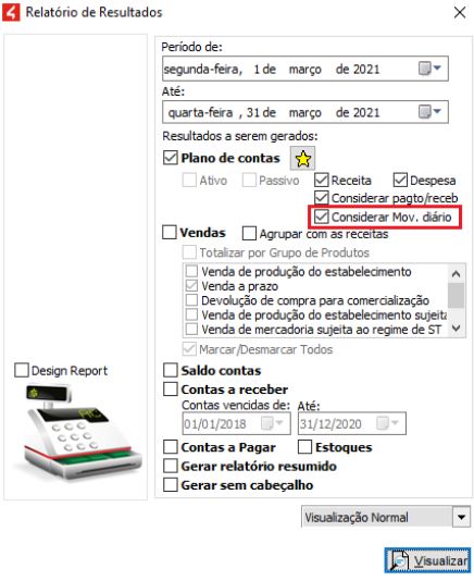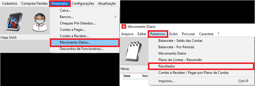 Para gerar o relatório acesse o menu Financeiro > Movimento Diário > Relatórios > Resultados: