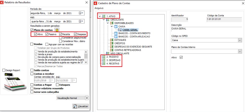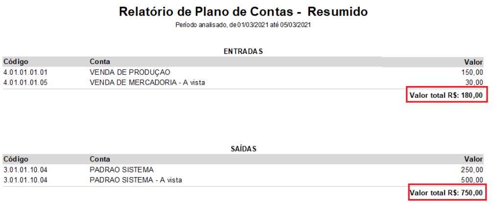 Esses mesmos valores podem ser obtidos no módulo Financeiro - Relatórios - Plano de Contas Resumido:
