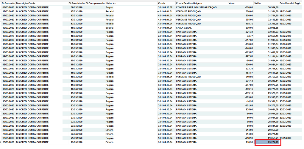 No exemplo acima, pode ser visto uma conta do Ativo (Caixa Geral). O valor pode ser conferido no relatório abaixo: