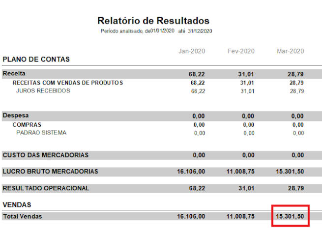Este relatório é propriamente para visualizar os resultados (em valores) atingidos pela empresa durante o período informado.