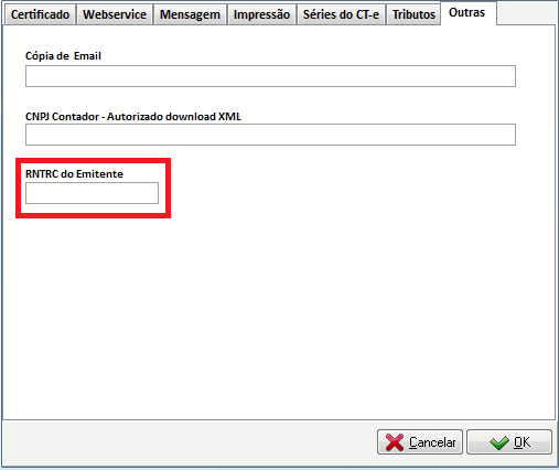 Na aba Outras, preencha corretamente o RNTRC de sua transportadora (emitente);