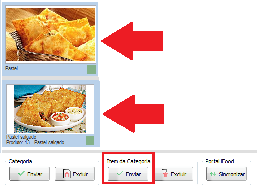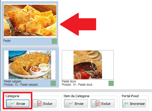 No Gestor, será carregada a tela com suas categorias (favoritos), para associar ao ifood, selecione-a e em seguida na Categoria, clique em Enviar, com isso, ela será enviada para o Ifood.