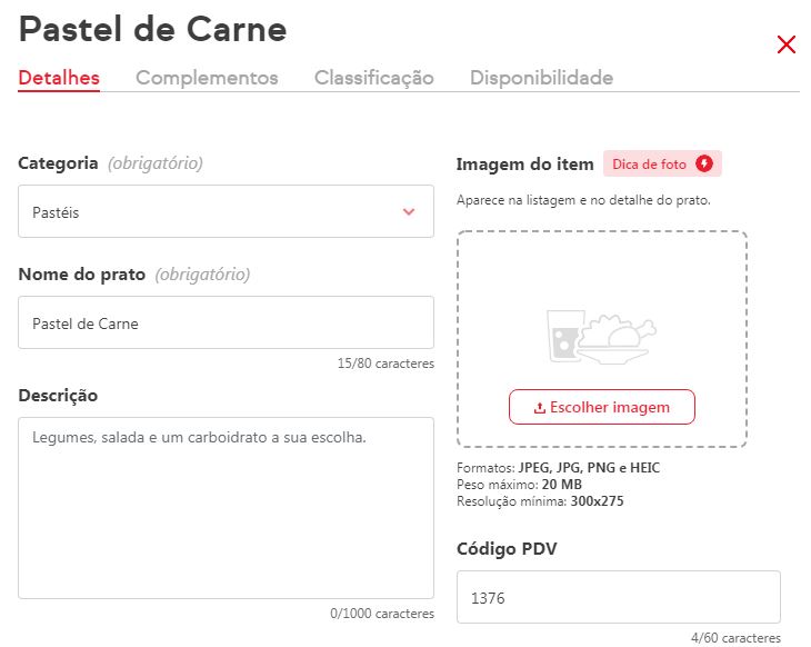 Será disponibilizada a tela para preenchimento dos detalhes que serão exibidos no Ifood, juntamente com o complemento criado anteriormente.