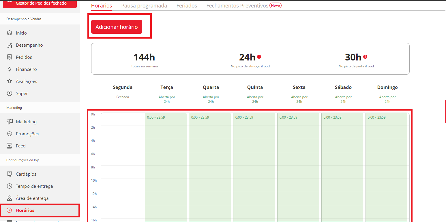 Atenção! Para que consiga abrir o restaurante, você deverá logar em sua conta no Ifood, clicar no botão Horários e adicionar o horário que está abrindo o restaurante pelo sistema, caso não adicione horário no portal do ifood, não irá comunicar no sistema!