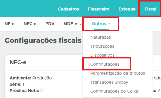 Acesse: Fiscal - Outros - Configurações;