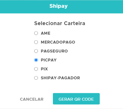 Em seguida, defina a carteira (conforme contratada carteira digital e informada junto a Shipay) e clique no botão Gerar QRCode;