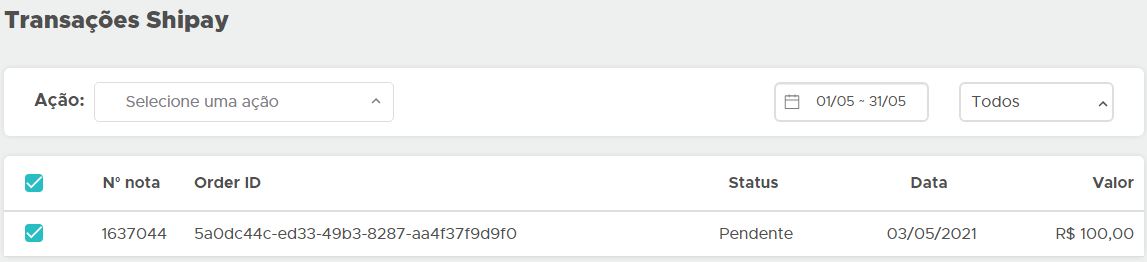 Será exibida a tela com todas as transações efetuadas na ShiPay, você poderá visualizar o status de cada uma e na ação poderá cancelar ou consultar para atualizar o status, além de poder filtrar por data e status