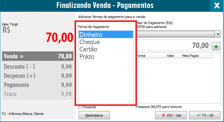 OBS: Todos os meios de pagamento serão impressos.