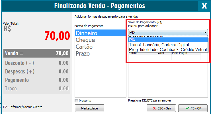 OBS: Ao escolher a opção Dinheiro, e escolher a forma de pagamento PIX, o valor entrará no caixa geral após efetuar o fechamento de caixa, agora, se você utilizar a forma de pagamento Prazo/Cartão juntamente com o meio de pagamento PIX, as parcelas constarão no contas a receber para recebimento futuro.