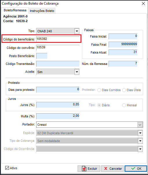Na tela de configuração do Boleto de Cobrança é necessário cadastrar: