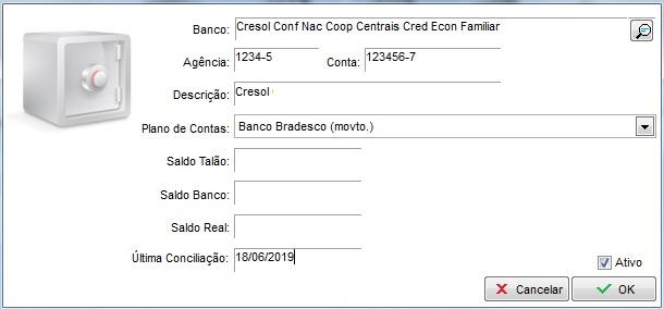 Na descrição preencha conforme achar conveniente, escolha o plano de contas Banco Bradesco (movto.), os campos: Saldo Talão, Saldo Banco, Saldo Real e Última Conciliação serão preenchidos conforme ir movimentando valores no banco.