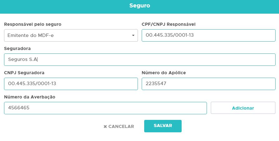 Nos Dados do Seguro, informe o seguro da carga, clicando em Novo Seguro será possível definir;
