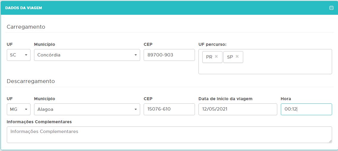 Nos Dados da Viagem, escolha a UF, município e CEP de carregamento, juntamente com a UF do percurso, no exemplo, consideramos que a mercadoria está saindo de SC e indo para MG, passando pelos estados do PR e SP