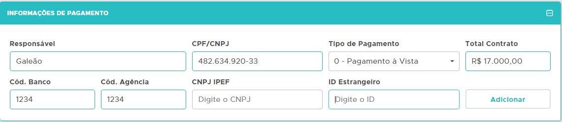 Nas Informações de Pagamento, escolha o pagamento, os dados de código do banco, CNPJ IPEF (Instituição de Pagamento Eletrônico de Frete) e ID estrangeiro não são obrigatórios;