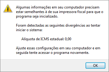 Palavras-Chave: "Algumas informações em seu computador precisam estar semelhantes à de sua impressora fiscal para que o programa seja inicializado. Alíquota de ICMS estadual: 0,00"