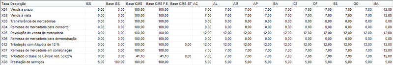 A taxa utilizada precisa possuir a Base de ICMS e a alíquota de todos os estados preenchida (conforme orientação do contador).