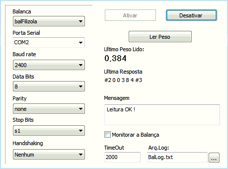 Neste momento irá ser feita a leitura do peso que consta na balança no momento. Caso seja informado algum caractere diferente do peso indicado na balança, deverá ajustar a velocidade da porta de comunicação.