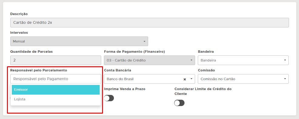 Ao configurar um parcelamento (03) - Cartão de Crédito, apresenta o campo RESPONSÁVEL PELO EMISSOR