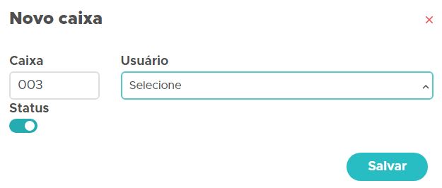Em seguida, informe o número do caixa e o usuário responsável pelo caixa, caso queira desativar para não apresentar mais posteriormente, desmarque a opção Status;