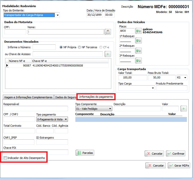 reabra o MDF-e e siga até a aba Informações do pagamento e marque a opção Indicador de Alto Desempenho;