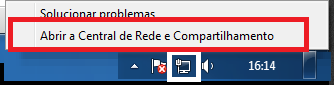 Para realizar a alteração, clique com o botão direito no ícone da rede (próximo ao relógio do Windows) e clique em Abrir a Central de Rede e Compartilhamento;