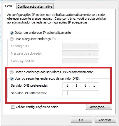 Marque a opção Usar os seguintes endereços de servidor DNS e direcione para os códigos: