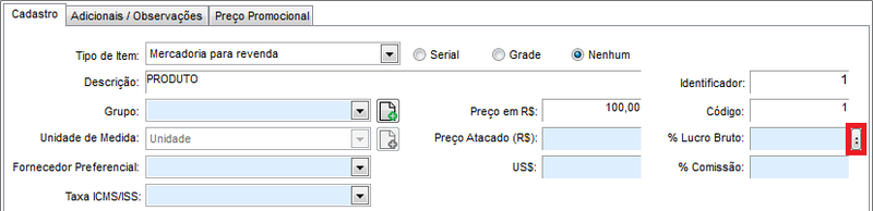 Para facilitar a obtenção do seu % Lucro Bruto utilize o Assistente de Cálculo do Preço de Venda (botão encontrado ao lado desse campo na ficha cadastral do produto).