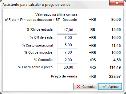Utilizando essa ferramenta do programa, o lojista tem maior facilidade para calcular corretamente o preço de venda dos seus produtos. São considerados para o cálculo fatores/valores como: