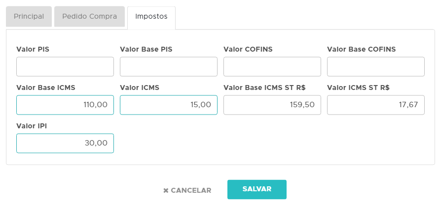 Em seguida você poderá informar os Impostos correspondentes ao item lançado;