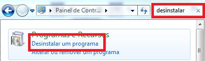 Em seguida, na caixa de pesquisa, digite a palavra DESINSTALAR e clique no atalho desinstalar um programa;