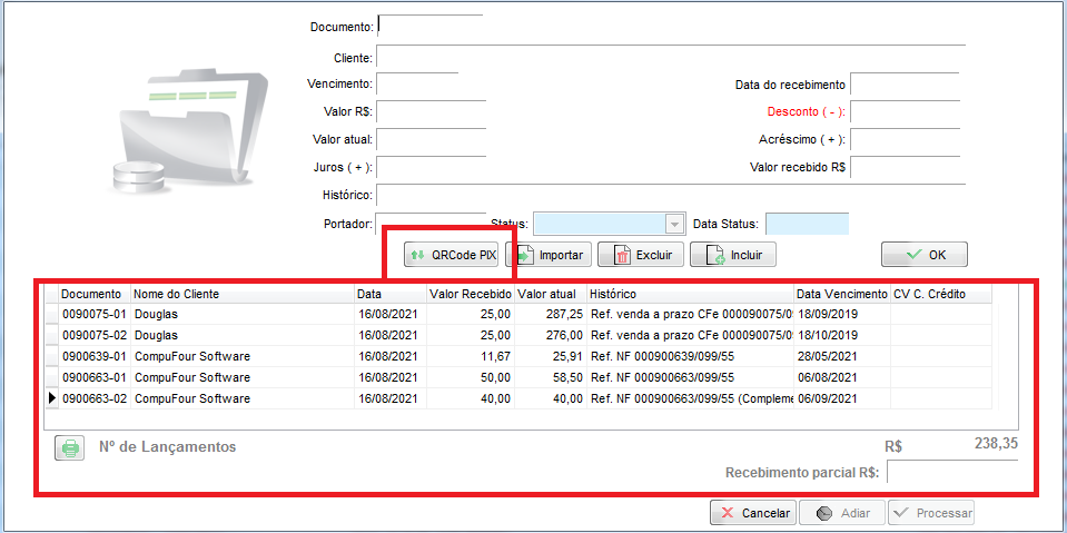 Em seguida, clique em QRCode PIX, logo abaixo, serão carregados os títulos que foram pagos, após conferir os lançamentos, clique no botão Processar.