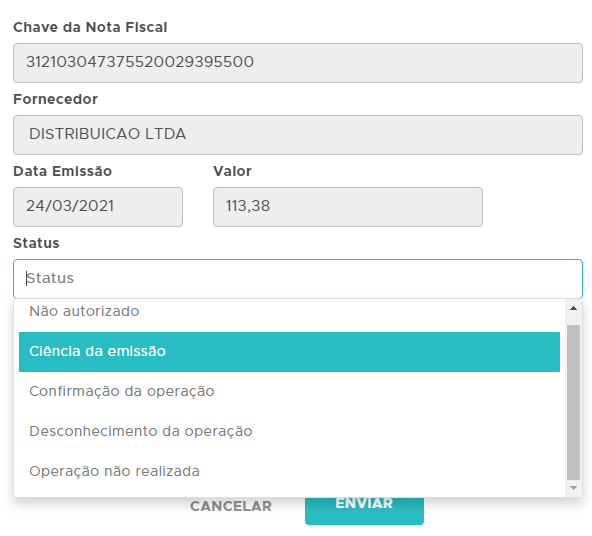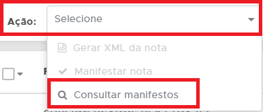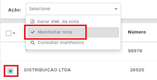 Caso tenham, retornará a listagem de notas em sua tela, marque o documento que deseja manifestar e na ação, escolha Manifestar nota;