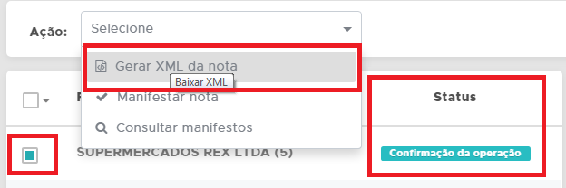 Após Confirmar a operação é possível obter o XML da nota, para isso, escolha a nota a qual confirmou a operação, clique em Ação - Gerar XML da nota;