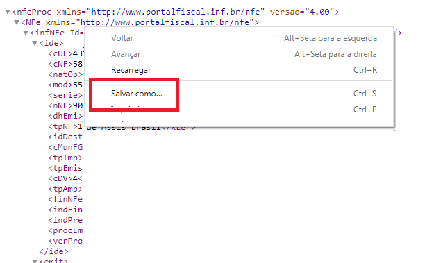 O XML será gerado na tela, clique com o botão direito - salvar como e escolha um local em sua máquina para salvar;