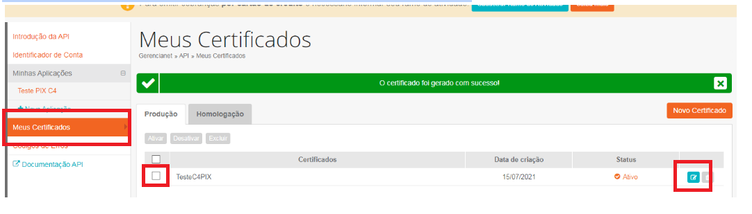 Em seguida, clique no botão Meus Certificados e no botão Novo Certificado, será criado um certificado que poderá ser baixado ao marcar o checkbox;