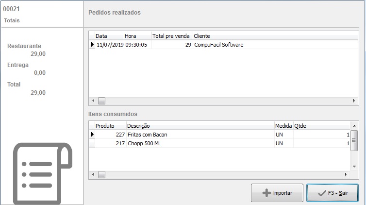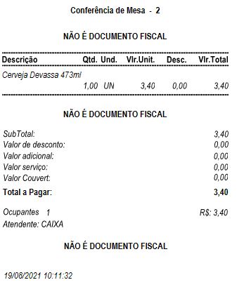 Será impresso uma conferência de tudo que foi consumido, totalizando valores de Couvert e Taxa de Serviço (quando possuir).