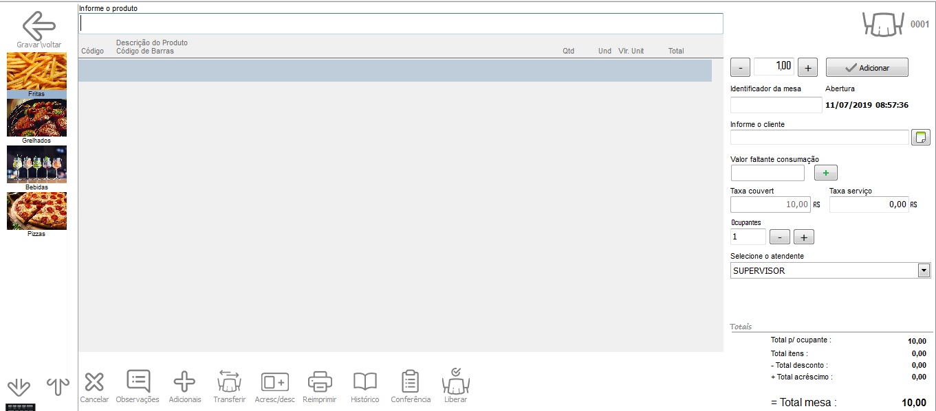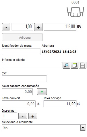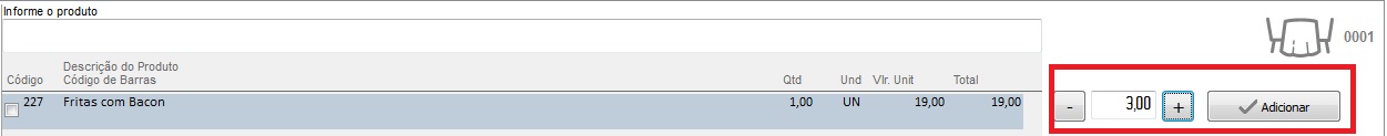 Após selecionar o produto que será consumido, ao lado direito da tela deverá selecionar a quantidade de cada item lançado na mesa.