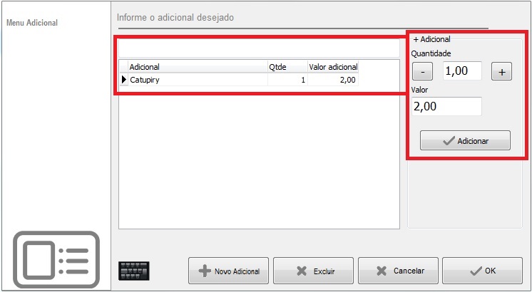 Após cadastrar os adicionais, será necessário localizar e preencher a quantidade e o valor.