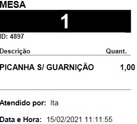 os itens serão impressos - Bebidas no Bar e Alimentos na cozinha caso estejam configurados, abaixo um modelo de impressão.