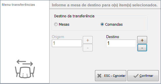 Informe se os itens serão transferidos para uma mesa ou para uma comanda e em seguida, no campo destino indique o para qual mesa/comanda e clique em confirmar.