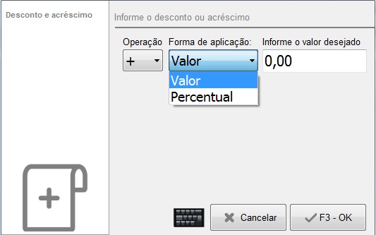 Na função de acréscimo e descontos é possível adicionar acréscimo ou conceder descontos no pedido, é possível lançar em Valor (R$) e Percentual (%).