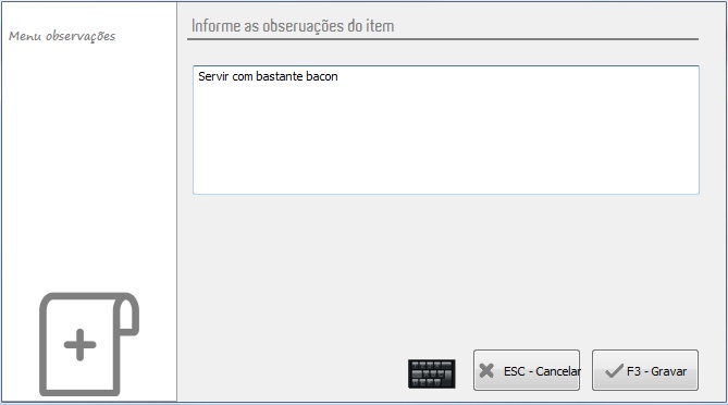 Após informar as observações do item, clique em F3 - Gravar, o conteúdo aqui informado sairá impresso no pedido.