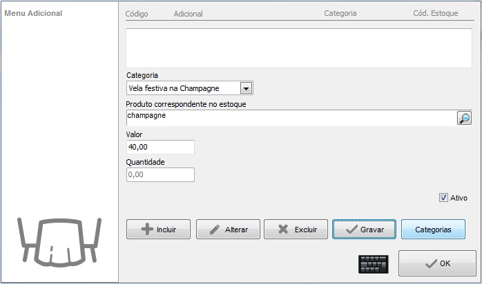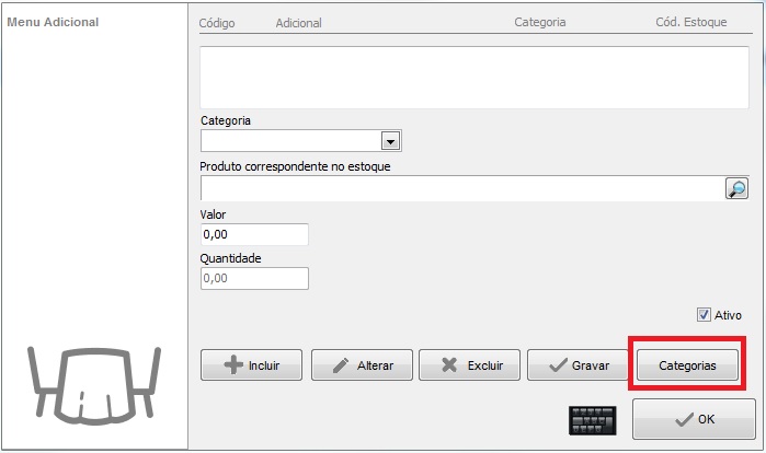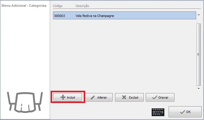 Clique no botão Incluir e informe a descrição da categoria (máximo 30 caracteres) e clique em Gravar.