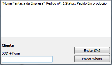 Após a configuração, ao alterar o status de um pedido será exibida uma tela com o texto que deseja ser enviado e um campo para informar o telefone (o telefone será preenchido se estiver informado no cadastro do cliente):